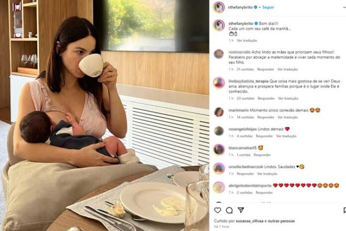 A atriz aparece com o bebê no colo durante o café da manhã e aproveita para enviar um recado a todos os seus fãs e seguidores. “Bom dia! Cada um com o seu café da manhã…”, escreveu.