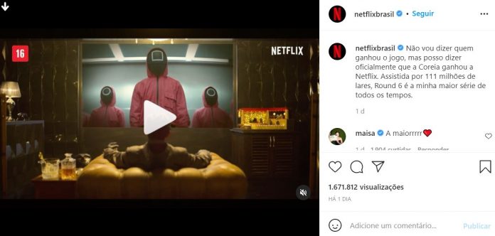 Na conta oficial do Instagram, a Netflix postou um vídeo para falar sobre a incrível marca: “Não vou dizer quem ganhou o jogo, mas posso dizer oficialmente que a Coreia ganhou a Netflix. Assistida por 111 milhões de lares, Round 6 é a minha maior série de todos os tempos”, escreveram.