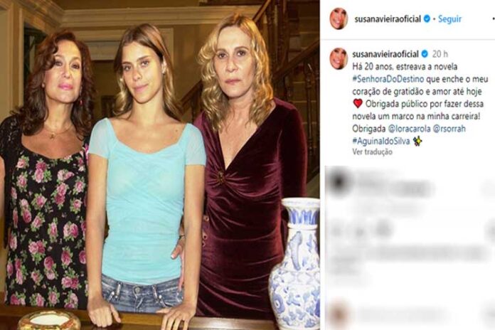 Na legenda, a veterana celebrou os 20 anos de exibição da produção de Aguinaldo Silva, responsável por quebrar recordes de audiência na TV Globo. “Há 20 anos, estreava a novela Senhora do Destino, que enche o meu coração de gratidão e amor até hoje. Obrigada, público, por fazer desta novela um marco na minha carreira! Obrigada, Carolina Dieckmann, Renata Sorrah e Aguinaldo Silva“, disse Susana.