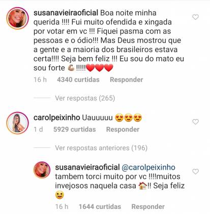 “Carol Peixinho também torci muito por você!!! Muitos invejosos naquela casa!! Seja feliz”, comentou ela.