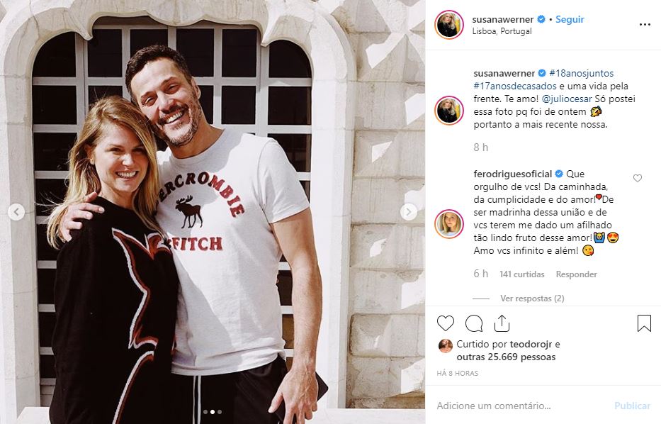 Dia de celebração! Susana Werner e Julio Cesar estão celebrando 17 anos de casados e 18 anos de relacionamento neste sexta-feira (26). E para as bodas de rosas não passar em branco o casal usou as redes sociais para se declararem.
