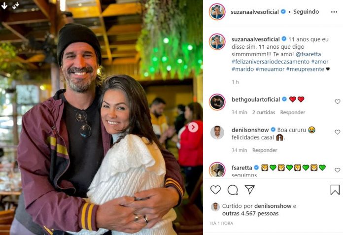 Nesta segunda-feira, 11, Suzana Alves está completando onze anos de casamento com Flávio Saretta.