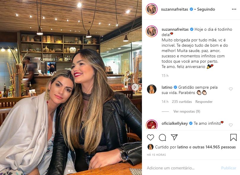 Em seguida Suzanna continuou felicitando Kelly Key: “Te desejo tudo de bom e do melhor! Muita saúde, paz, amor, sucesso e momentos infinitos com todos que você ama por perto. Te amo, feliz aniversario”, finalizou ela.