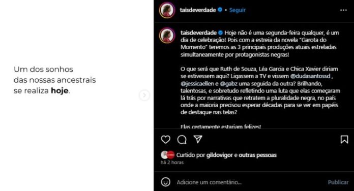 Além disso, Taís homenageou pioneiras como Ruth de Souza, Léa Garcia e Chica Xavier, lembrando o legado dessas mulheres e imaginando como elas se sentiriam ao ver esse avanço. Para Taís, essa conquista atual é fruto de uma luta iniciada há muitos anos.