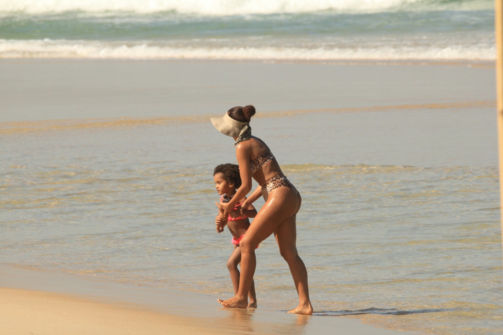 Aproveitando as férias escolares da herdeira e também do dia ensolarado que fez nesta quinta-feira (11) no Rio de Janeiro, a artista foi flagrada na praia do Lebron, vestindo um biquíni de oncinha, a estrela chamou atenção com o corpo impecável, enquanto renovava o bronze e as energias.