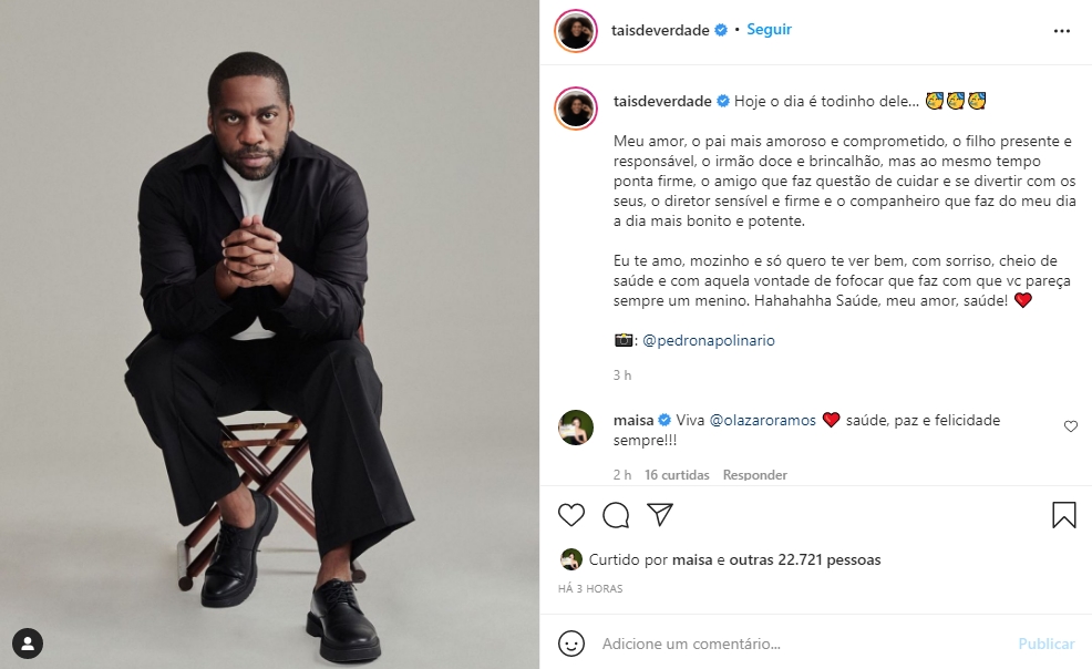 Amigos e fãs também parabenizaram o ator e deixaram mensagens de carinho nos comentários da publicação de Taís: “Feliz vidaaa” “Parabéns demais” “Um casal de respeito. Admiro”