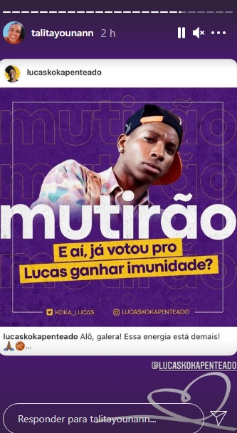 A atriz na utilizou seus Stories para publicar uma foto do colega, já declarando que fará um mutirão para que o ator siga no jogo. Mesmo antes da estreia oficial que acontece no próximo dia 25 de janeiro, a casa já está pegando fogo, já que o público pode votar para dar imunidade a seis participantes do jogo. As apostas já começaram para ver quem sai na frente no reality. ( veja foto abaixo)