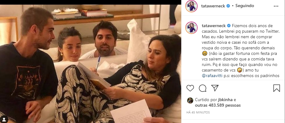 Tatá Werneck não deixa de fazer piada até mesmo com sua vida pessoal. Na tarde desta sexta-feira, 8, a apresentadora celebrou mais um ano de casamento com o ator Rafa Vitti.