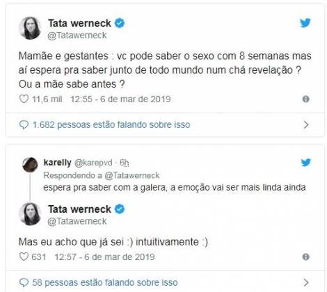 Através do twitter, Tatá revelou que tem uma intuição sobre o sexo da criança. Tudo começou quando a contratada da Globo questionou as seguidoras se as mulheres esperam até a 8° semana para saber do sexo com as pessoas no ‘chá de bebê’ ou se elas sabem antes.