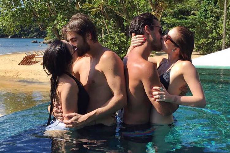 Tatá postou no Instagram, uma foto de Marina com o marido Xandinho Negrão e dela com seu namorado Rafa Vitti, dentro de uma piscina se beijando.