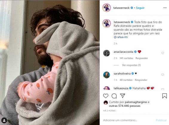 Na legenda, Tatá não perdeu tempo em elogiar os dois, mas claro sempre utilizando a sua maneira de ser engraçada: “Toda foto que tiro do Rafa distraído parece quadro e quando são as minhas fotos distraída parece que fui atingida por um raio”.legendou a apresentadora global.