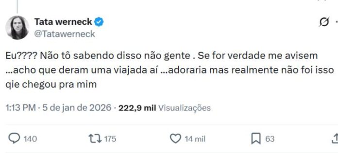 “Eu? Não estou sabendo disso, não, gente!”, negou, logo de cara. Em seguida, Tatá fez o pedido e alfinetou a informação: “Se for verdade, me avisem. Acho que deram uma viajada aí. Adoraria, mas realmente não foi isso que chegou pra mim”, completou a artista.