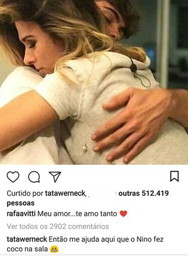 No último domingo, Vitti publicou uma foto romântica dos dois no Instagram. Com a legenda é “Meu amor… te amo tanto“. O comentário de Tatá Werneck foi hilário: “Então me ajuda aqui que o Nino fez coco na sala“, escreveu ela.