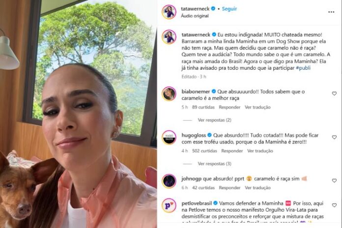 Na legenda, Werneck reforçou sua indignação com bom humor: “Eu estou indignada! Muito chateada mesmo! Barraram a minha linda Maminha em um Dog Show porque ela não tem raça. Mas quem decidiu que caramelo não é raça? Quem teve a audácia? Todo mundo sabe o que é um caramelo. A raça mais amada do Brasil! Agora o que digo para a Maminha? Ela já tinha avisado para todo mundo que ia participar”, expressou Tatá.