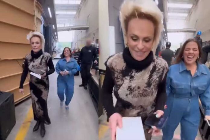 Ana aparece caminhando pelos bastidores enquanto cumprimenta a equipe, quando é surpreendida por Tati, que corre até ela “pegando-a de surpresa”. “Oi, gata”, diz a apresentadora, arrancando risos da companheira de Louro José. “Eu vim correndo”, explica.