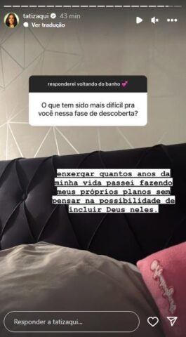Na noite da última quarta-feira, 13 de dezembro, a ex-peoa resolveu abrir uma caixinha de perguntas em sua conta oficial do Instagram Stories e recebeu o seguinte questionamento: ”O que tem sido mais difícil pra você nessa fase de descoberta?”, indagou o internauta. Tati respondeu: ”Enxergar quantos anos da minha vida passei fazendo meus próprios planos sem pensar na possibilidade de incluir Deus neles”, enfatizou a ex-cantora de funk. Confira!