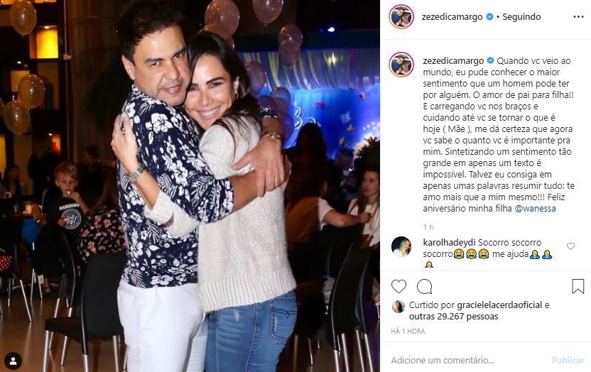 “Sintetizando um sentimento tão grande em apenas um texto é impossível. Talvez eu consiga em apenas umas palavras resumir tudo: te amo mais que a mim mesmo!!! Feliz aniversário minha filha @wanessa”, declarou o cantor.