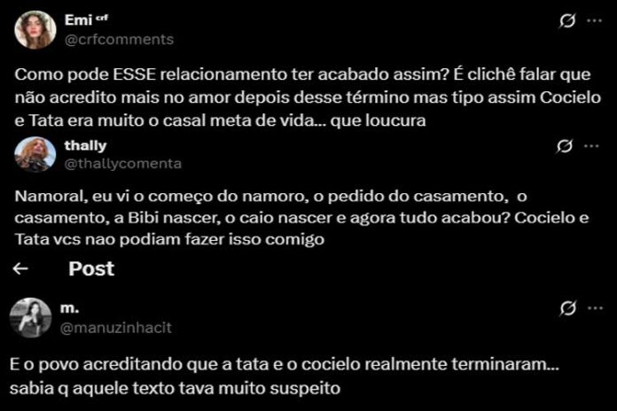 “Como pode esse relacionamento ter acabado assim? É clichê dizer que não acredito mais no amor depois desse término, mas, tipo assim, Cocielo e Tatá eram muito o casal meta de vida… Que loucura”, afirmou outro.