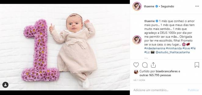 “1 mês que conheci o amor mais puro… 1 mês que meus dias tem muito mais sentido… 1 mês que agradeço a DEUS 1000x por dia por me permitir ser sua mãe… Obrigada por ter me escolhido, filha! Prometo ser a sua casa, o seu lugar…”, disse ela.