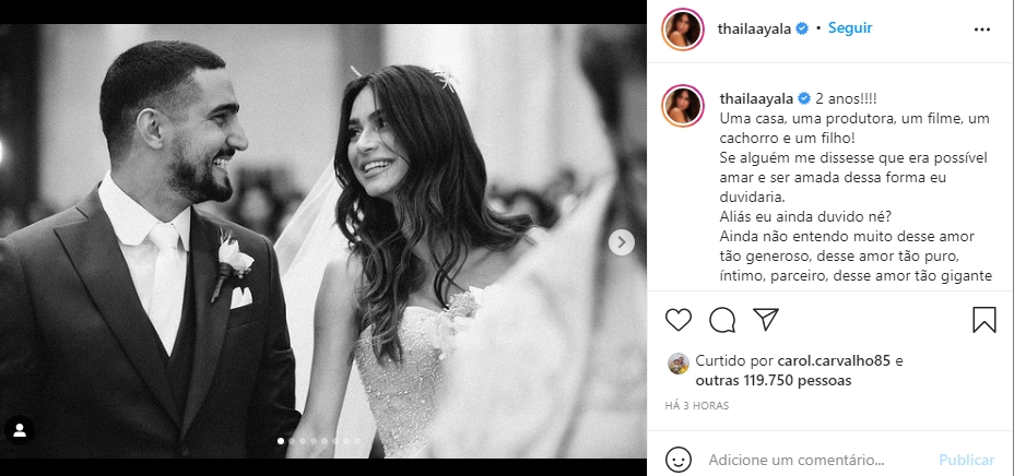 Os dois estão celebrando mais um aniversário de casamento. Nas plataformas digitais, grávida do primeiro filho do casal, a famosa celebrou seus 2 anos de casamento. Ela compartilhou algumas fotos do dia especial na vida dos famosos quando eles deram sim ao amor. Thaila Ayala prestou uma linda homenagem ao amado.