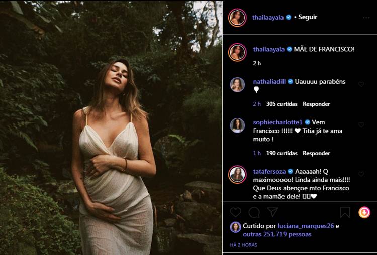 Em seu perfil no Instagram, Thaila publicou uma foto ressaltando a barriguinha, que ainda está nos primeiro meses. Na legenda, ela se limitou a dizer. “Mãe de Francisco”, revelando que terá um menino.