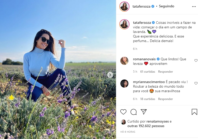 Em seu Instagram a esposa do cantor publicou uma foto em um lindo cenário e escreveu na legenda: “Coisas incríveis a fazer na vida: começar o dia em um campo de lavanda. Que experiência deliciosa. E esse perfume… Delícia demais!”