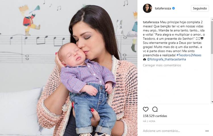 “Meu príncipe hoje completa 2 meses! Que benção ter vc em nossas vidas meu anjo.. Mamãe te ama tanto, tanto… ida e volta! “Para alegra e multiplicar o amor.. o Teodoro, é um presente do Senhor!” Sou eternamente grata a Deus por tantas graças! Muito mais do q um dia sonhei.. e vc é parte disso meu amor! Me sinto preenchida e realizada!”, escreveu a atriz.