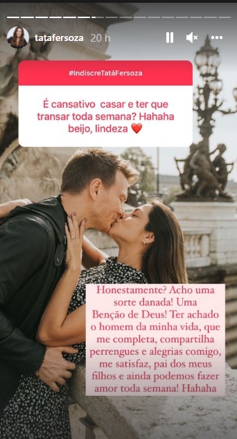 Sincera ela não demorou a responder: “Honestamente? Acho uma sorte danada. Uma benção de Deus! Ter achado o homem da minha vida, que me completa, compartilha perrengues e alegrias comigo, me satisfaz, pai dos meus filhos e ainda podemos fazer amor toda semana!”, comentou ela.