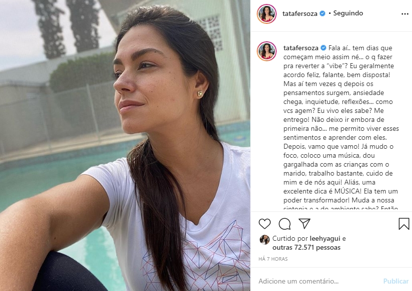 E seguiu seu desabafo: “Eu geralmente acordo feliz, falante, bem disposta! Mas aí tem vezes que depois os pensamentos surgem, ansiedade chega, inquietude, reflexões… Eu vivo eles sabe?”.