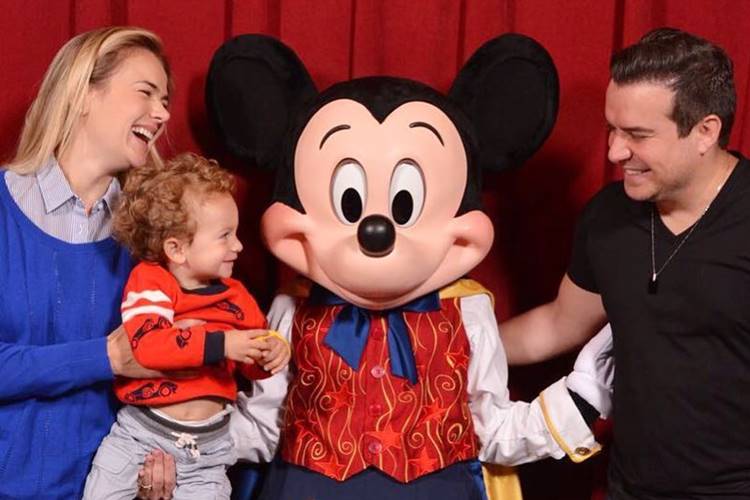 No click, a atriz e o marido, o cantor Belutti aparecem sorridentes na companhia do filho, Luis Miguel, de 1 ano e 10 meses e do famoso personagem, Mickey.