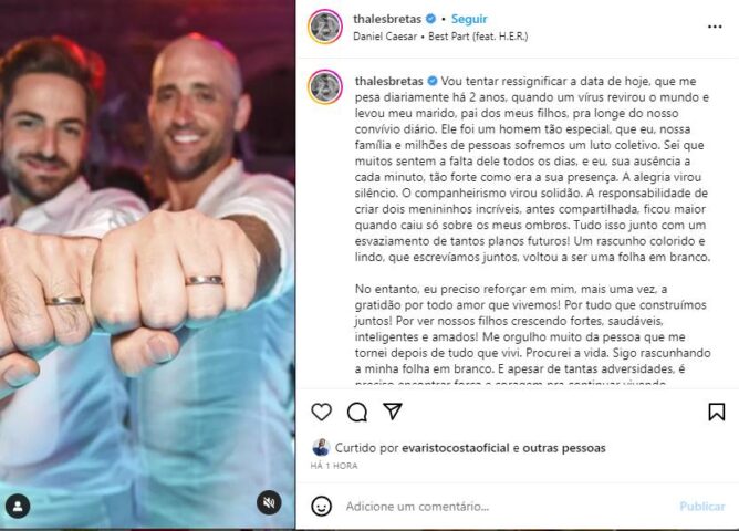 Dessa forma, por meio do feed do Instagram, Thales Bretas compartilhou alguns momentos com o humorista e, na legenda, refletiu: “Vou tentar ressignificar a data de hoje, que me pesa diariamente há 2 anos, quando um vírus revirou o mundo e levou meu marido, pai dos meus filhos, pra longe do nosso convívio diário. Ele foi um homem tão especial, que eu, nossa família e milhões de pessoas sofremos um luto coletivo“, iniciou ele.