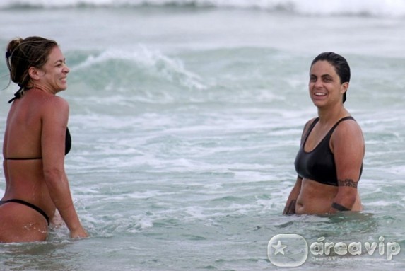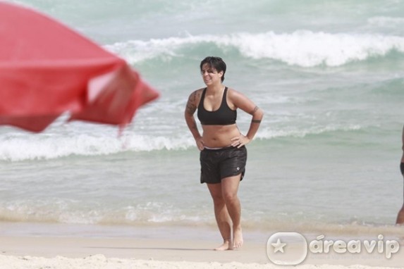 Thammy Miranda foi clicada no domingo (17) na praia da Barra da Tijuca, no Rio de Janeiro. A atriz que vive a Jô em ‘Salve Jorge’, curtiu a praia acompanhada. Thammy entrou de bermudão no mar.