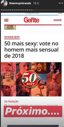 Até o momento, Thammy está na 14ª colocação de um total de 50. O ator recebeu cerca de 2 milhões de votos ficando na frente de outros galãs como Reynaldo Gianecchini, Neymar e Rodrigo Santoro. Em seu perfil no Instagram, o filho de Gretchen falou sobre a votação: “Gente, vocês estão vendo aí essa votação?”, questionou ele.