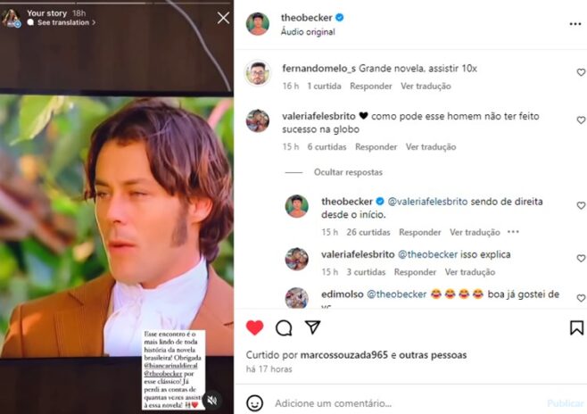 Na legenda da publicação, antes de responder os comentários dos seguidores, Theo afirmou que ‘A Escrava Isaura’ foi a sua maior colaboração para a dramaturgia nacional. “Esse trabalho valeu como minha maior colaboração a Teledramaturgia Brasileira“, declarou o ator. “Com Marcos Paulo, a novela era boa, mas nós éramos bem melhores“, ainda escreveu ele, nos comentários, sobre o folhetim.
