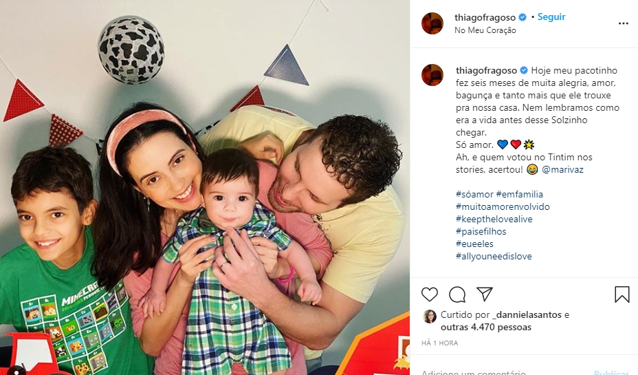 Na legenda, ele comemorou. “Hoje meu pacotinho fez seis meses de muita alegria, amor, bagunça e tanto mais que ele trouxe pra nossa casa. Nem lembramos como era a vida antes desse Solzinho chegar. Só amor. ❤”, escreveu.