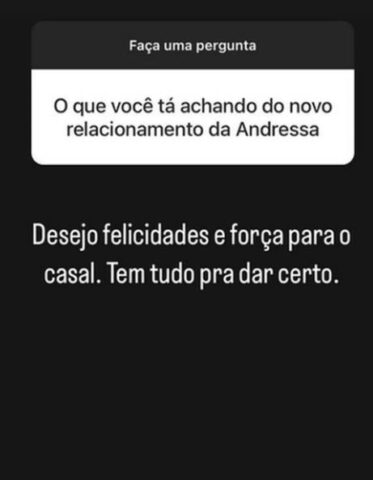 Dessa forma, por meio da caixinha de perguntas no Instagram, Thiago Lopes recebeu o seguinte questionamento de um seguidor: “O que está achando sobre o novo relacionamento da Andressa?“, perguntou o fã. Rapidamente, Lopes reagiu e respondeu de forma direta ao assunto: “Desejo felicidade e força ao casal. Tem tudo pra dar certo“, disse ele, sem mais e nem menos.