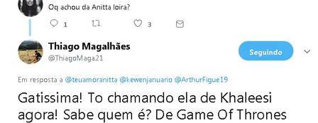 Thiago Magalhães não nega que está apaixonado pela cantora Anitta. Em conversa com os fãs no Twitter, o empresário disse que aprovou o novo visual da artista, que está loiríssima e revelou que passou a chamá-la de Khaleesi, famosa personagem da série “Game of Thrones”.