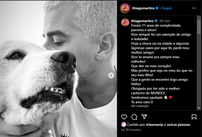 Através de sua conta oficial do Instagram, o artista revelou que passou 11 anos ao lado pet: ”Foram 11 anos de cumplicidade, parceria e amor! Xico sempre foi um exemplo de amigo e lealdade! Hoje a chuva cai na cidade e algumas lágrimas caem por aqui tb, perdi meu melhor amigo!”, iniciou.