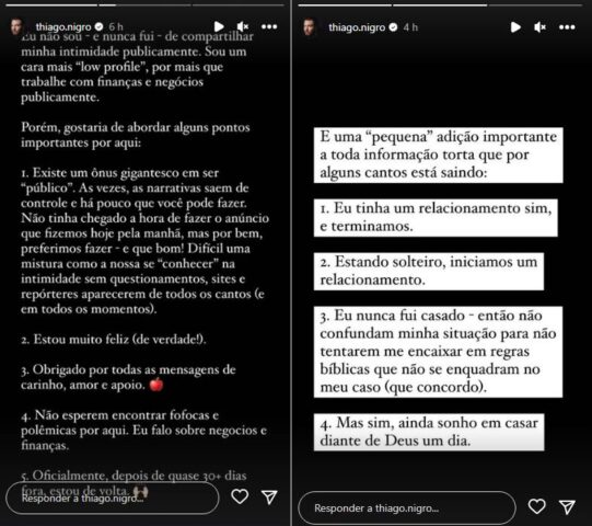 Na sequência, ele afirma que os seguidores não podem esperar fofocas a respeito de seu romance com Maíra. Nigro expõe: ”Existe um ônus gigantesco em ser ‘público’. Às vezes, as narrativas saem de controle e há pouco que você pode fazer. Não tinha chegado a hora de fazer o anúncio que fizemos hoje pela manhã, mas, por bem, preferimos fazer – e que bom! Estou muito feliz (de verdade!). Não esperem encontrar fofocas e polêmicas por aqui. Eu falo sobre negócios e finanças.”