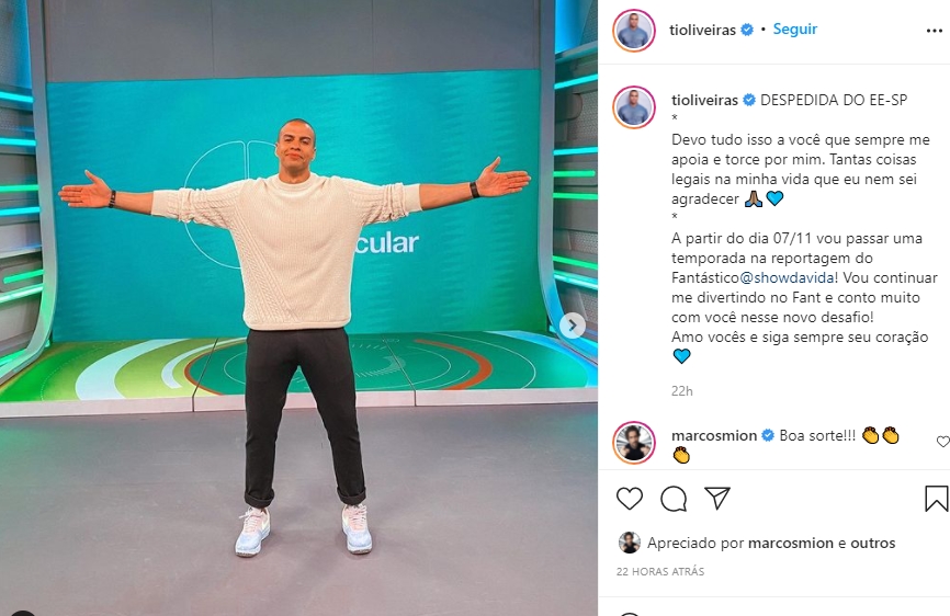 O jornalista Thiago Oliveira usou suas redes sociais neste domingo, 31 de outubro, para oficializar sua saída do “Esporte Espetacular” da TV Globo. Isso porque o famoso comunicou que deixará o papel de apresentador do programa para assumir um novo cargo no Fantástico.