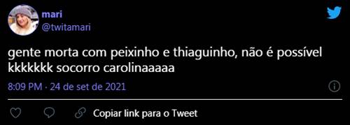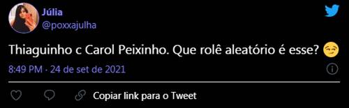 Logo alguns internautas levantaram a lebre no Twitter. “Gente, morta com peixinho e thiaguinho, não é possível kkkk socorro carolinaaaa”, disse uma. “Thiaguinho com Carol Peixinho. Que rolê aleatório é esse?”, escreveu outra.