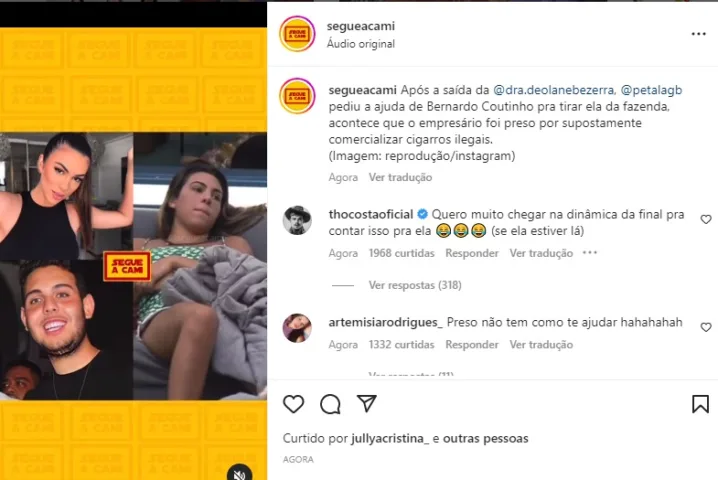 ”Quero muito chegar na dinâmica da final pra contar isso pra ela (se ela estiver lá)”, zombou o ex-Carrossel em um comentário deixado na página ”Segue a Cami” no Instagram que publicou o vídeo da peoa.