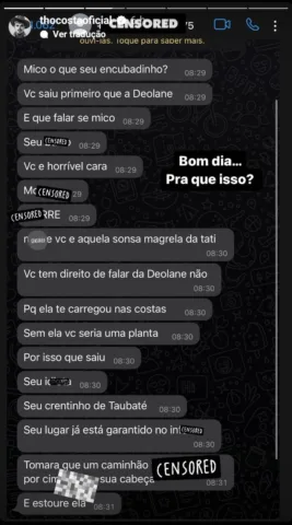 Logo em seguida prossegue: ”Vc tem direito de falar da Deolane não. Pq ela te carregou nas costas. Sem ela vc seria uma planta. Por isso que saiu. Seu crentinho de Taubaté. Seu lugar já está garantido no inferno. Tomara que um caminhão passe por cima da sua cabeça e estoure ela.”