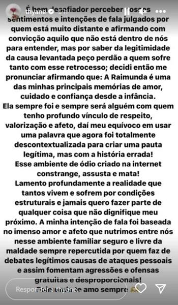 Thyane continua ressaltando o carinho que tem com Raimunda: “A Raimunda é uma das minhas principais memórias de amor, cuidado e confiança desde a infância. Ela sempre foi e sempre será alguém com quem tenho profundo vínculo de respeito, valorização e afeto, daí meu equívoco em usar uma palavra que agora foi totalmente descontextualizada para criar uma pauta legítima, mas com a história errada!”.