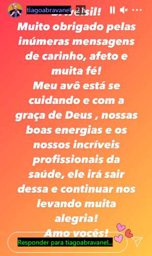 No stories do Instagram, Tiago fez um post e primeiro agradeceu os fãs do avô. “Muito obrigado pelas inúmeras mensagens de carinho, afeto e muita fé!”, escreveu na mensagem.