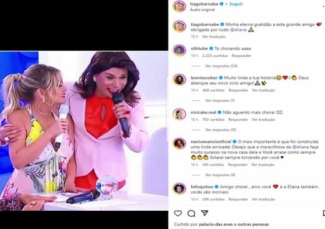 Compartilhando vários registros em que ambos aparecem juntos em momentos especiais na TV e nos bastidores, Tiago ressaltou sua amizade com Eliana agradecendo por tudo o que ela proporcionou em sua carreira.