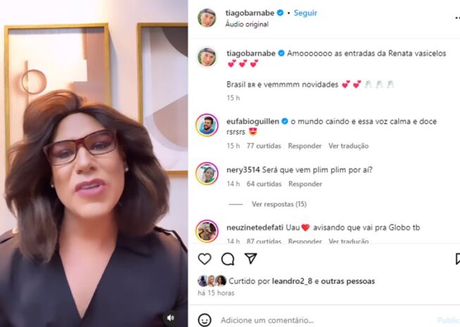 Vale enfatizar que, na legenda do vídeo publicado no feed do Instagram, onde surge imitando a renomada jornalista, Tiago revelou que em breve estará chegando novidades: “Amooooooo as entradas da Renata Vasicelos. Brasile vemmmm novidades“, disparou ele, deixando muitos curiosos sobre o que vem por ai.