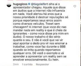 Hugo Gloss não deixou barato e rebateu o apresentador da TV Globo. “Olha aí, o apresentador chegou. Aquele que disse em áudio que a internet não influencia em nada. Você alertou há anos que a nossa prioridade é destruir reputações só porque reportamos seus arraso assim como diversos veículos. Tweet sem checagem? A internet (que você diz não mandar nada em reality e que é cheia de ignorantes — como você disse para mim em áudio). O nosso trabalho é tão sério quanto o seu. E não é você que vai vir aqui apontar o dedo para nos ensinar a trabalhar, como você faz durante o BBB quando se irrita quando reportamos qualquer erro. Dê você o exemplo e vá aprender a apresentar um reality sem se envolver emocionalmente. Eu hein”, rebateu o influencer.
