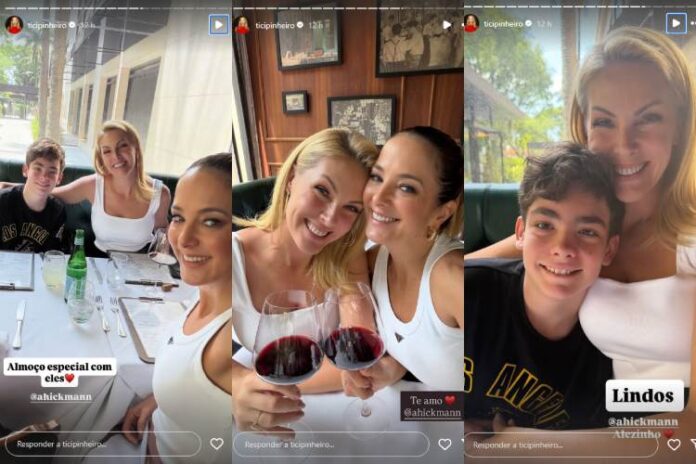 Tici compartilhou uma foto sorridente ao lado da amiga e abriu o coração: “Almoço especial com eles [Ana e Alezinho]. Te amo”, afirmou ela. Pinheiro também mostrou uma foto de Ana e Ale em meio ao almoço e enalteceu: “Lindos”, escreveu a mãe de Rafaella Justus e Manuella Tralli.