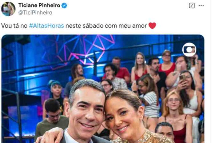 A notícia foi dada pela própria apresentadora em seu perfil no X. “Vou tá no #AltasHoras neste sábado com meu amor”, escreveu a apresentadora, exibindo uma foto ao lado de Cesar Tralli tirada durante a participação no Altas Horas.